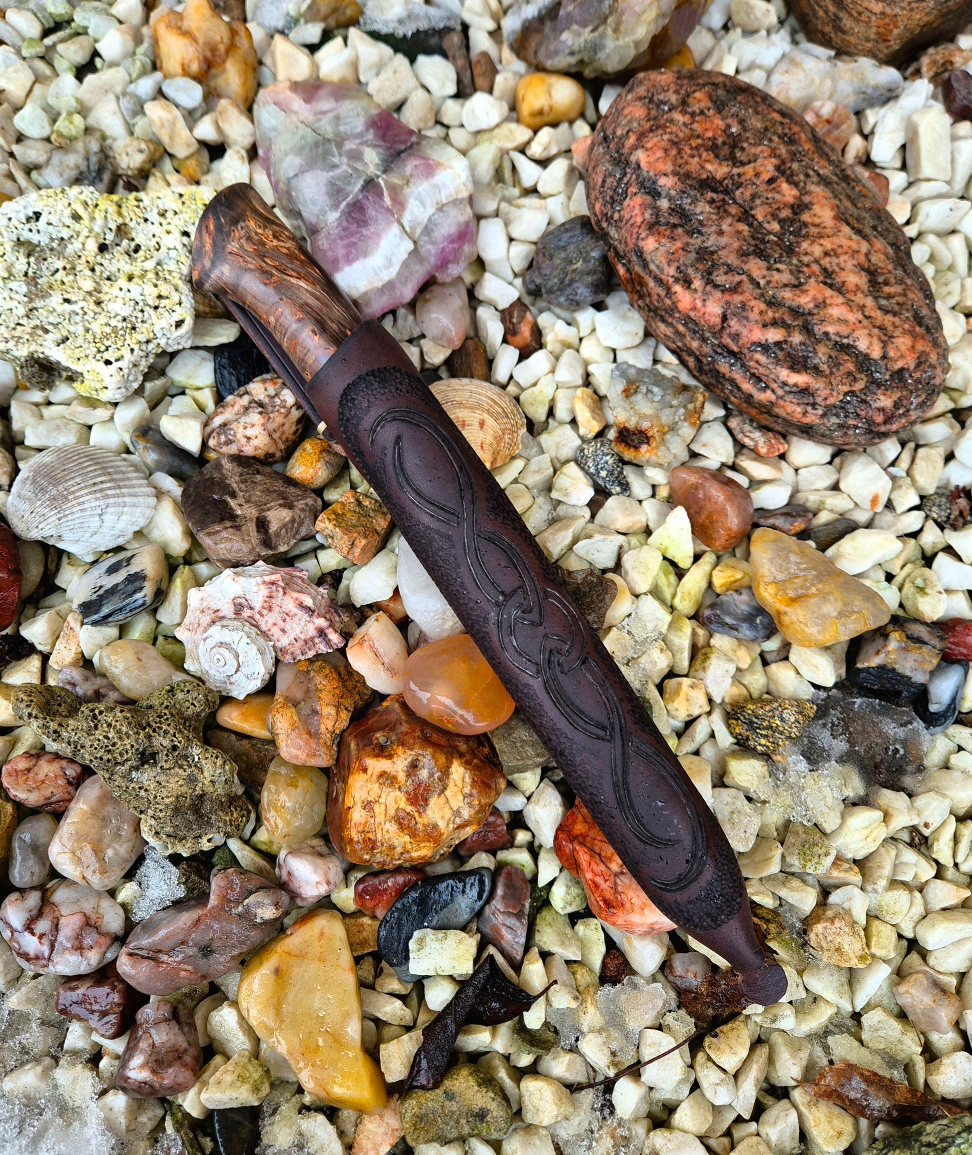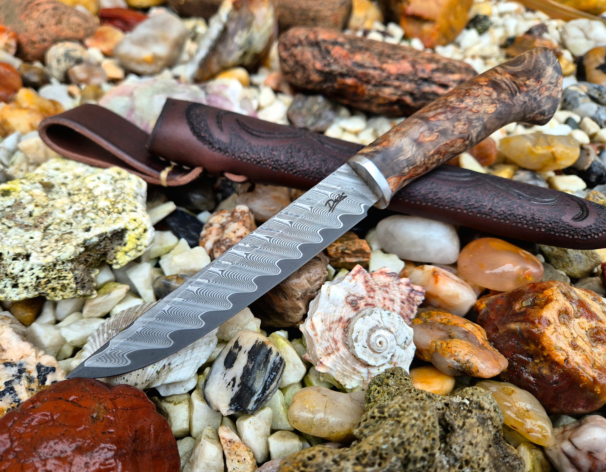 Tauchen Sie mit diesem handgefertigten Messer in die Welt präziser Handwerkskunst ein. Seine rostfreie Damastklinge mit faszinierendem Muster und einem Kern aus japanischem VG10-Stahl verspricht außergewöhnliche Schneidkraft und eine langlebige Schneide. Der stabilisierte Tannenzapfengriff ist meisterhaft anatomisch geformt und bietet maximalen Griffkomfort. Die luxuriöse, handgenähte Rindslederscheide, verziert mit Straußenhaut, unterstreicht seine Einzigartigkeit. Die Leichtigkeit und Balance des Messers garantieren eine angenehme Handhabung. Dieses Messer ist nicht nur ein Werkzeug, sondern ein Kunstwerk, das Sie verdienen.
