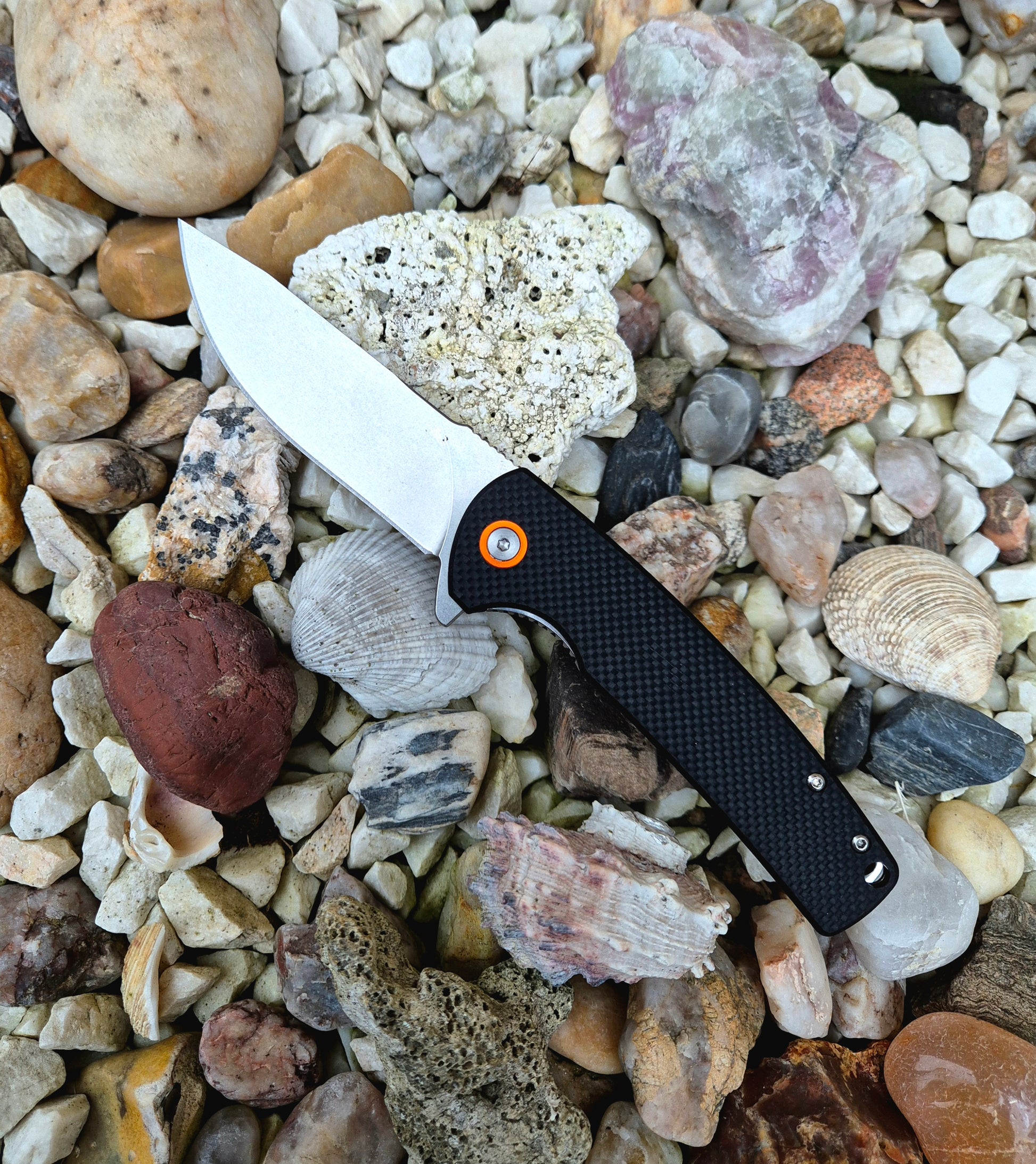 The handle is a masterful combination of lightweight and high-strength carbon fiber , which gives a modern, luxurious look and reduces the overall weight of the knife, and durable G10 composite , ensuring a fantastic grip in all conditions and excellent durability.