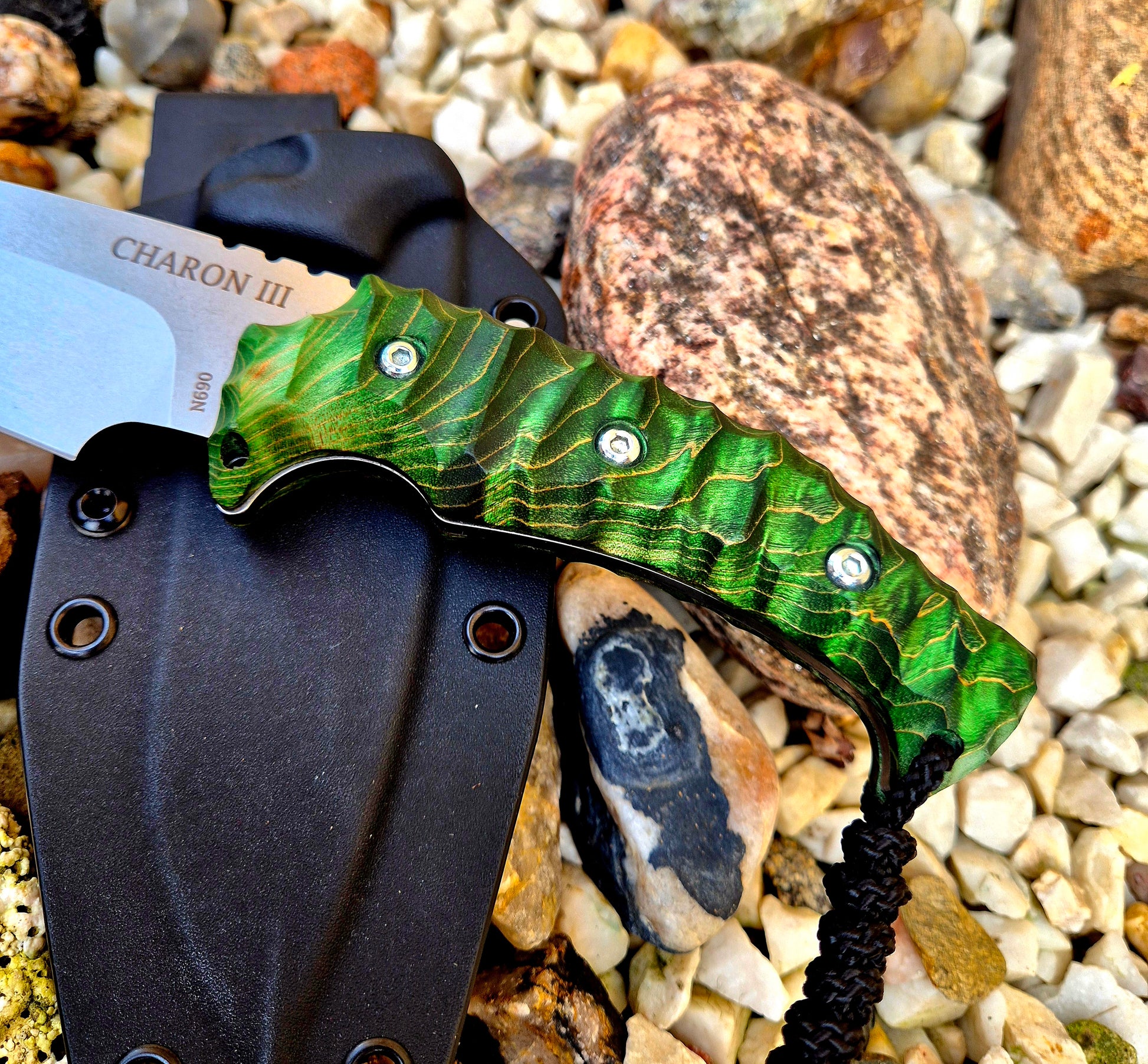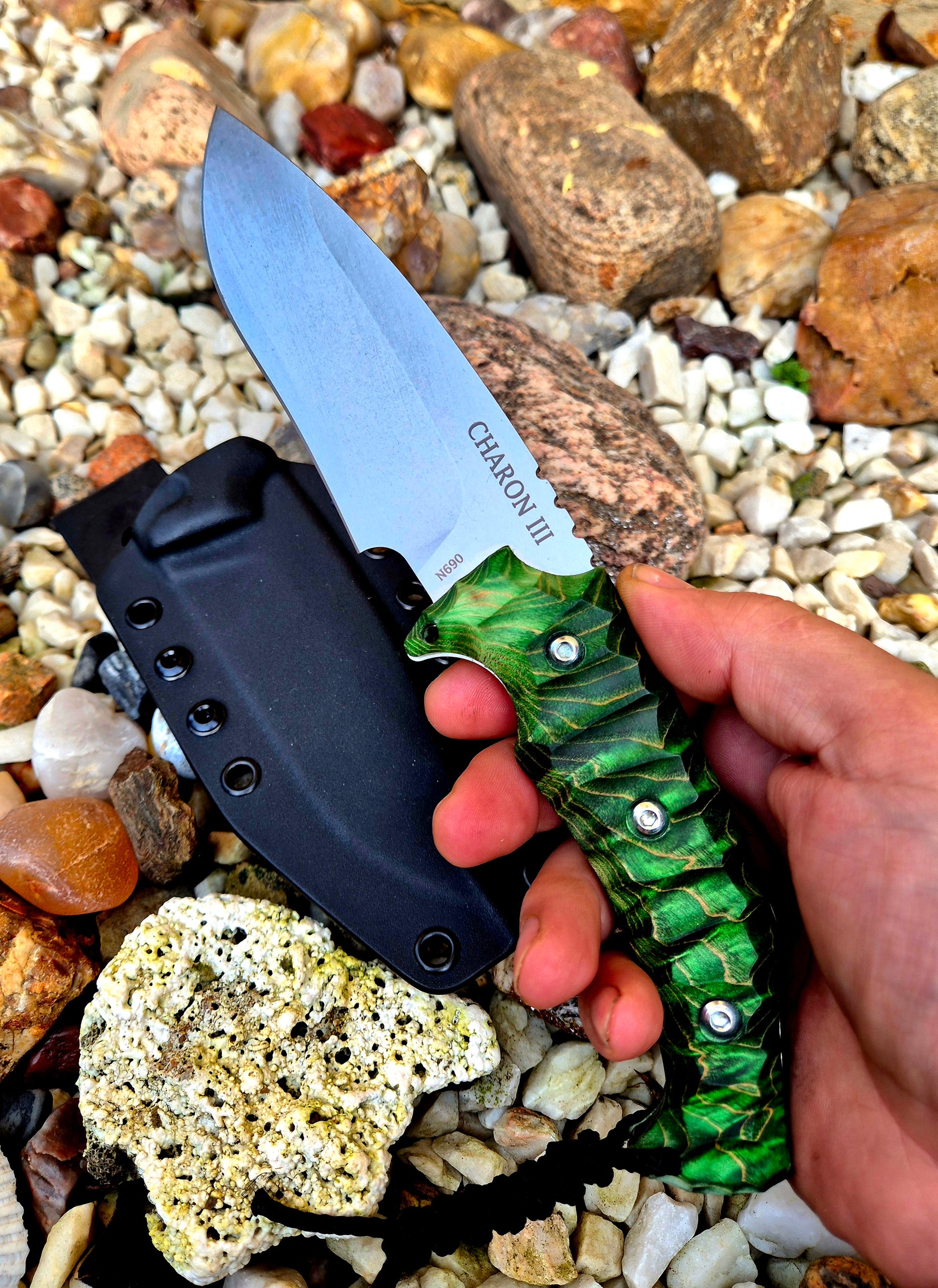 Nůž Charon III - Karelská bříza zelená N690 - Ruční práce